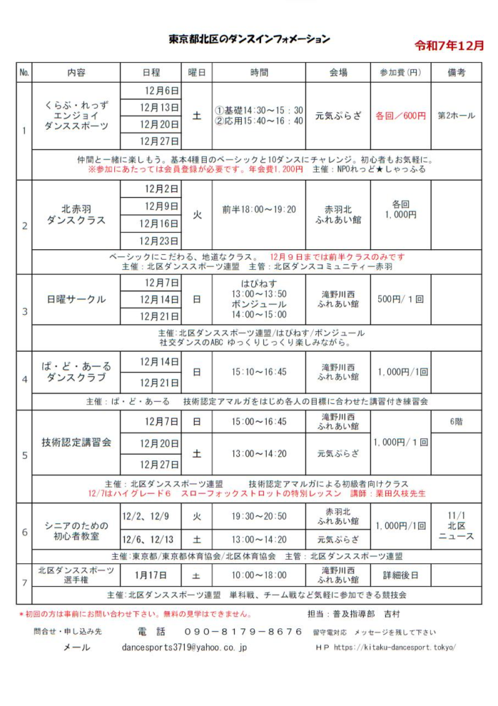 2025年12月のダンスインフォメーション 投稿ナビゲーション 2025年 カルチャーウィング文京 城北ブロックダンスパーティ第73回北区民体育大会第21回ダンススポーツ大会タイムテーブルと選手受付時間について